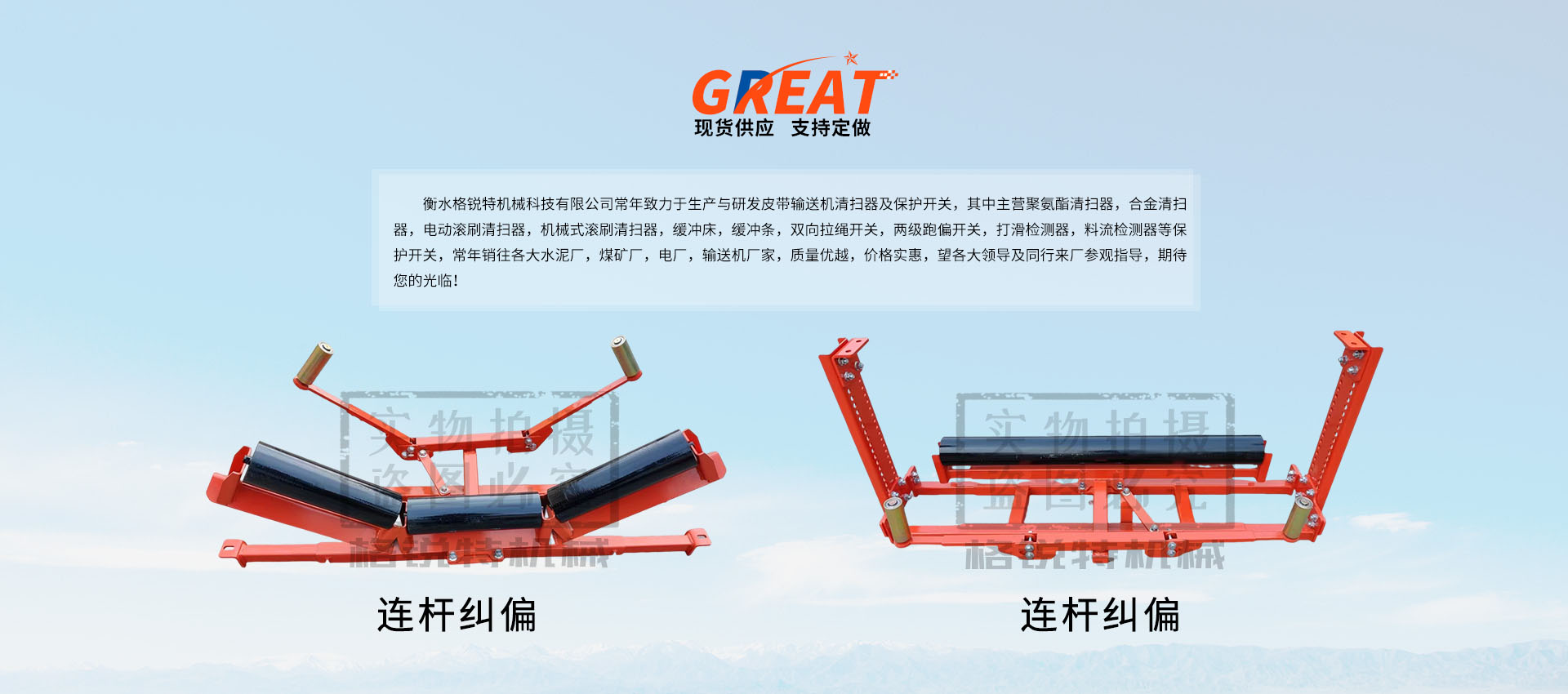 衡水格銳特機(jī)械科技有限公司常年致力于生產(chǎn)與研發(fā)皮帶輸送機(jī)清掃器及保護(hù)開(kāi)關(guān),其中主營(yíng)聚氨酯清掃器,合金清掃器,電動(dòng)滾刷清掃器,機(jī)械式滾刷清掃器,緩沖床,緩沖條,雙向拉繩開(kāi)關(guān),兩級(jí)跑偏開(kāi)關(guān),打滑檢測(cè)器,料流檢測(cè)器等保護(hù)開(kāi)關(guān),常年銷(xiāo)往各大水泥廠(chǎng),煤礦廠(chǎng),電廠(chǎng),輸送機(jī)廠(chǎng)家,質(zhì)量?jī)?yōu)越,價(jià)格實(shí)惠,望各大領(lǐng)導(dǎo)及同行來(lái)廠(chǎng)參觀(guān)指導(dǎo),期待您的光臨!??!